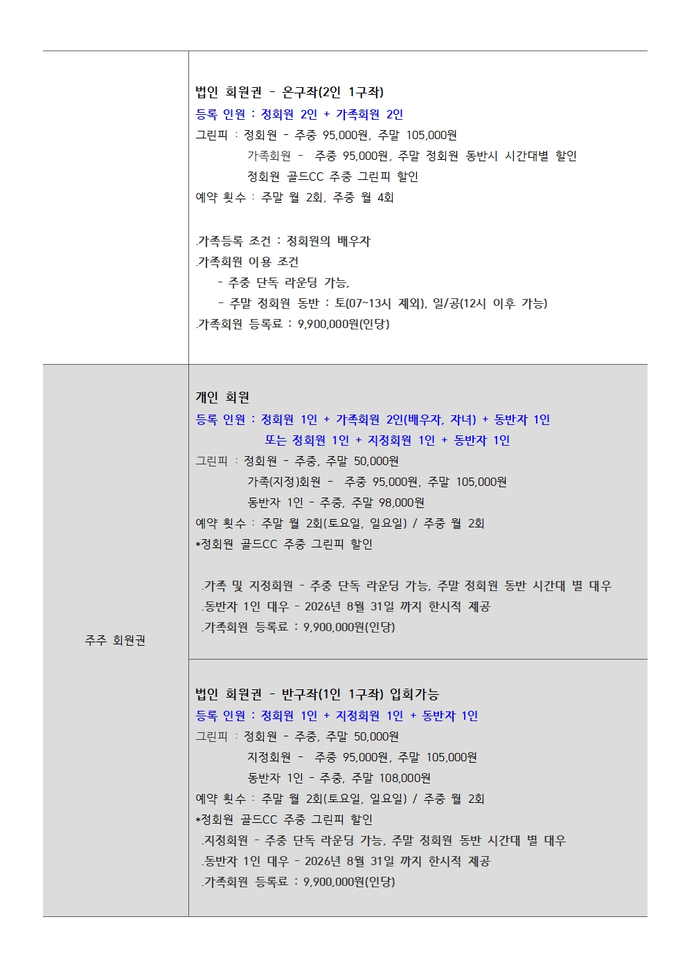 가족(지정)회원 주중 95,000원 / 주말 105,000원 정회원 동반 시간대별 대우